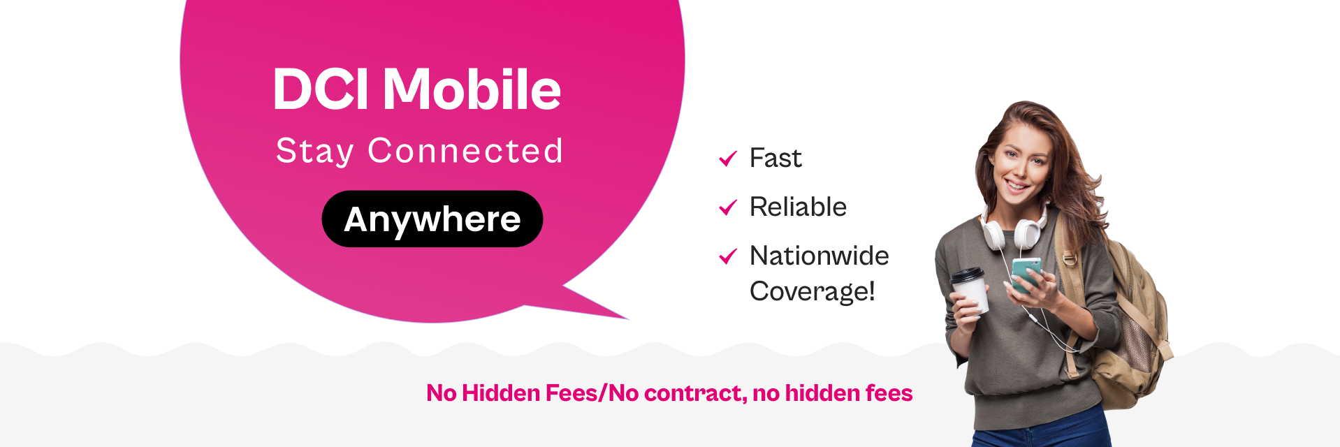 DCI Mobile delivers budget-friendly phone plans with nationwide coverage, offering flexible options for data, talk, and text—no contracts or hidden fees. Whether you're a heavy streamer, frequent traveler, or just need reliable service, our 4G LTE/5G network keeps you connected at unbeatable prices.Enjoy simple online sign-up, easy self-service management, and transparent billing—because everyone deserves quality wireless without the hassle. See what